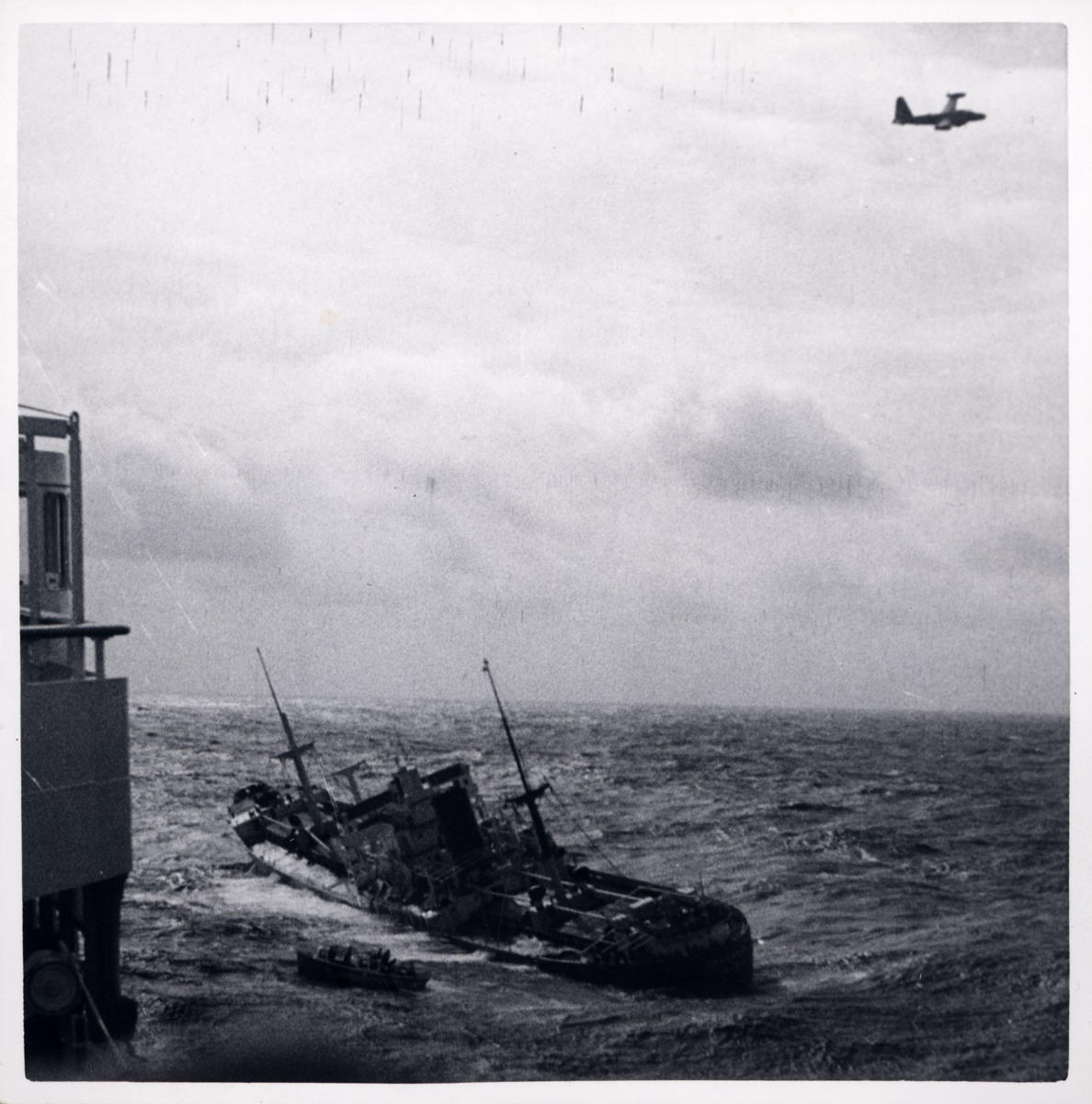 KUNGSHOLM är på väg västerut över Atlanten på hösten 1955. En italiensk eller grekisk kolångare havererade mitt på Atlanten under en storm och KUNGSHOLM fick hjälpa till att rädda besättningen. Först skulle besättningen gå armgång från kolångaren över till KUNGSHOLM på ett rep men en stor våg förstörde dessa möjligheter då rep och vajrar brast. KUNGSHOLM fick då sätta ner en av sina livbåtar för att kunna rädda besättningen från det havererade fartyget. Ett brittiskt spaningsflygplan cirkulerar över olycksplatsen.