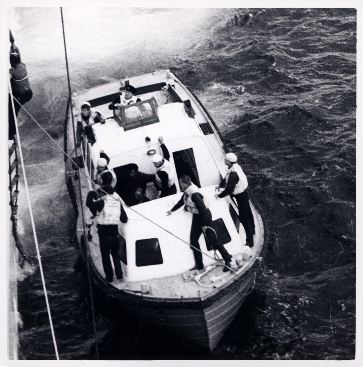 KUNGSHOLM är på väg västerut över Atlanten på hösten 1955. En italiensk eller grekisk kolångare havererade mitt på Atlanten under en storm och KUNGSHOLM fick hjälpa till att rädda besättningen. Först skulle besättningen gå armgång från kolångaren över till KUNGSHOLM på ett rep men en stor våg förstörde dessa möjligheter då rep och vajrar brast. KUNGSHOLM fick då sätta ner en av sina livbåtar för att kunna rädda besättningen från det havererade fartyget.