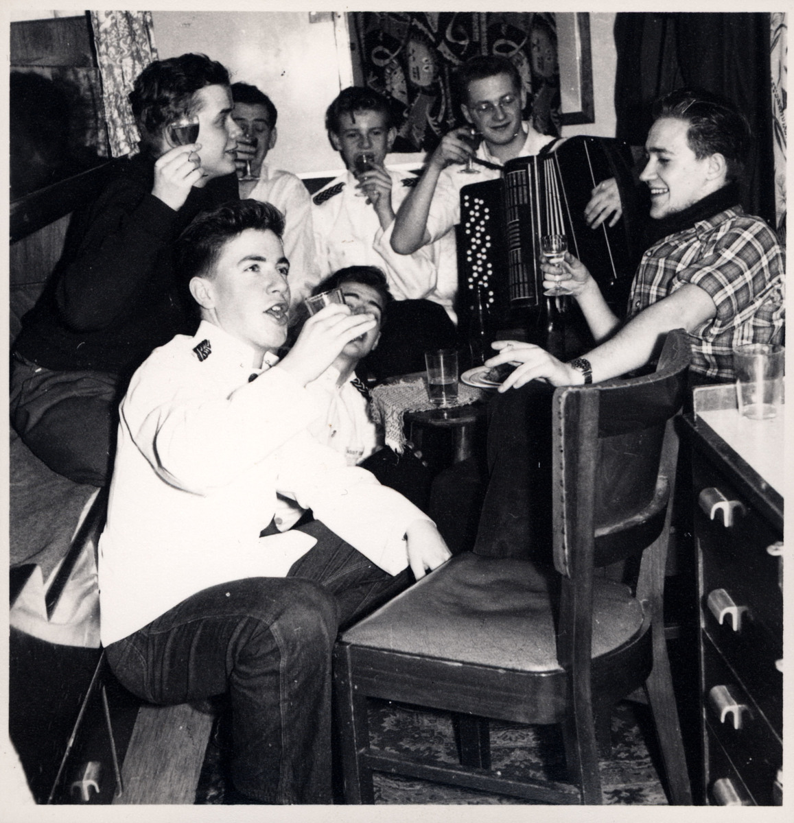 Fotografi på Stefan Centerwall och flera av hans kollegor ombord Svenska Amerika Liniens KUNGSHOLM. De är lediga från arbetet och sitter i en personalhytt. De har fest och dricker alkohol. Fotografiet är taget av någon av Stefans kollegor, antingen under en resa över Atlanten hösten 1955 eller under KUNGSHOLMs jorden-runt kryssning på våren 1956.