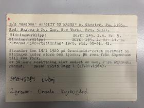 Kommer från fartyget MACONA som strandade och förliste 18 januari 1920 på Grundabåde-revet nordväst om Nidingen. Fartyget var då på väg från Köpenhamn till New York. Alla utom en i besättningen omkom.