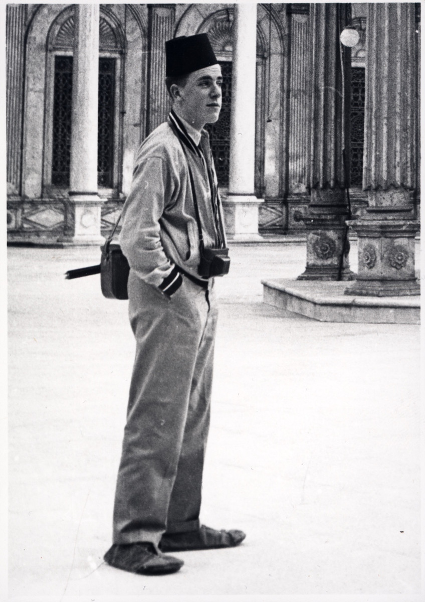 Mats Carlberg står i stora moskén i Kairo i slutet av januari 1956. Mats arbetade som hisspojke ombord KUNGSHOLM under fartygets jorden-runt kryssning på våren 1956. Under kryssningen fick även besättningen möjlighet att gå i land och se sig omkring under de många hamnstoppen. Ibland ordnades speciella utflykter för besättningen (som ej fick beblanda sig med kryssningsresenärerna), till fördelaktigt pris, och i bland gjorde besättningen egna utflykter, då ofta i mindre grupper. KUNGSHOLM gjorde två hamnstopp i Egypten under denna kryssning 1956: Alexandria 24-25 januari och Port Said 26 januari. Utflykten till Kairo genomfördes sannolikt under hamnstoppet i Alexandria.
