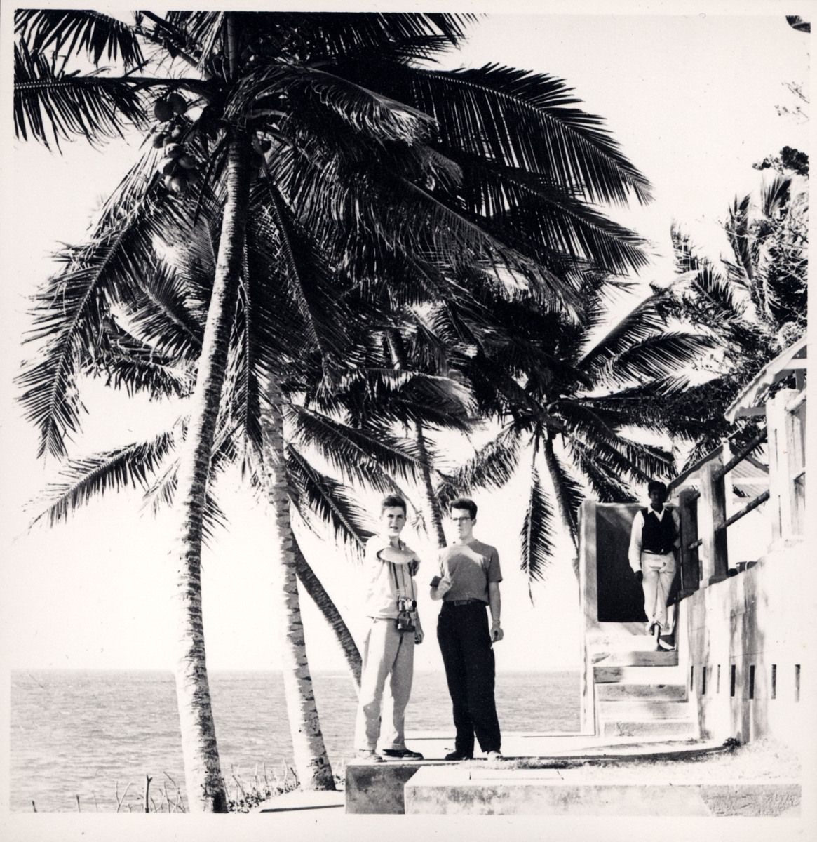 Två besättningsmän från KUNGSHOLM, en av dom är Mats Carlberg, står under några palmer utanför ett lyxhotell. Hotellet ligger utanför Colombo på Sri Lanka. Mats arbetade som hisspojke ombord KUNGSHOLM under fartygets jorden-runt kryssning på våren 1956. Under kryssningen fick även besättningen möjlighet att gå i land och se sig omkring under de många hamnstoppen. Ibland ordnades speciella utflykter för besättningen (som ej fick beblanda sig med kryssningsresenärerna), till fördelaktigt pris, och i bland gjorde besättningen egna utflykter, då ofta i mindre grupper. KUNGSHOLM hade hamnstopp i Colombo 13-14 februari 1956.