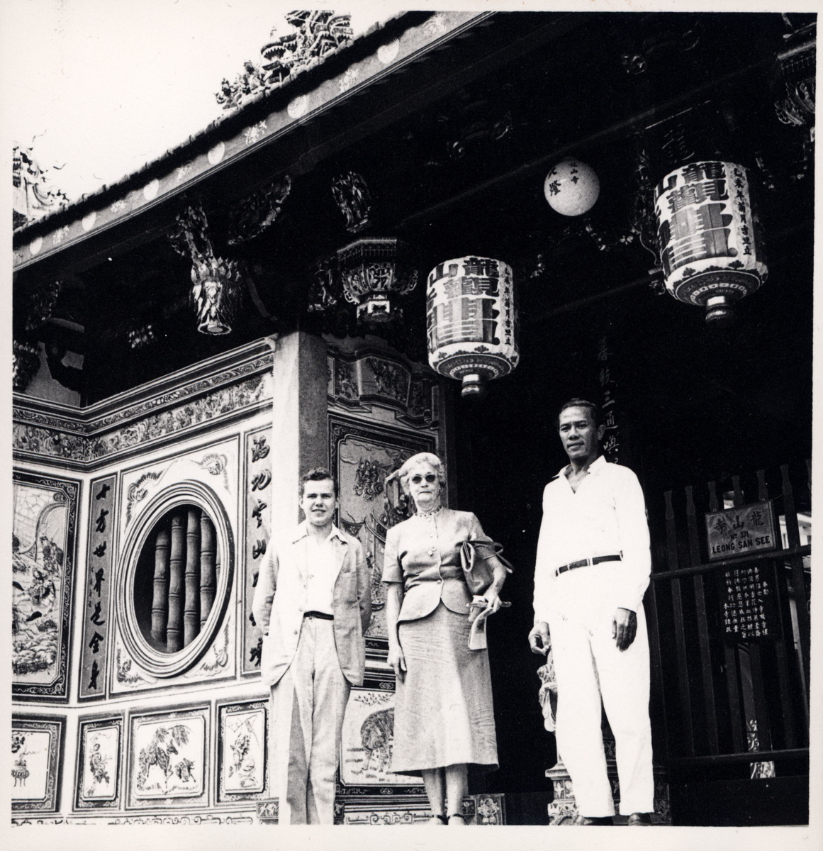 Stefan Centerwall står utanför ett tempel i Singapore tillsammans med en kvinnlig passagerare och en guide. Stefan arbetade som hisspojk ombord KUNGSHOLM under fartygets jorden-runt kryssning på våren 1956. Under kryssningen fick även besättningen möjlighet att gå i land och se sig omkring under de många hamnstoppen. Ibland ordnades speciella utflykter för besättningen (som vanligtvis inte fick beblanda sig med kryssningsresenärerna), till fördelaktigt pris, och i bland gjorde besättningen egna utflykter, då ofta i mindre grupper. KUNGSHOLM hade hamnstopp i Singapore 24-25 februari 1956.
