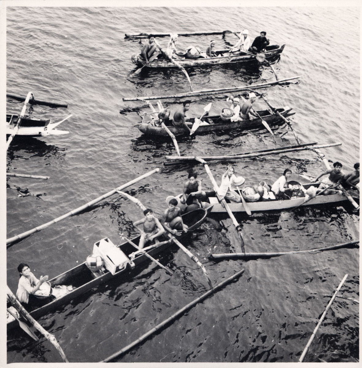 Försäljare av diverse varor sitter i sina sampans på vattnet utanför Bali. Försäljarna har rott upp till KUNGSHOLMs sida för att försöka sälja varor till passagerarna ombord. KUNGSHOLM var på jorden-runt kryssning på våren 1956 och gjorde hamnstopp på Bali 27-28 februari 1956.
