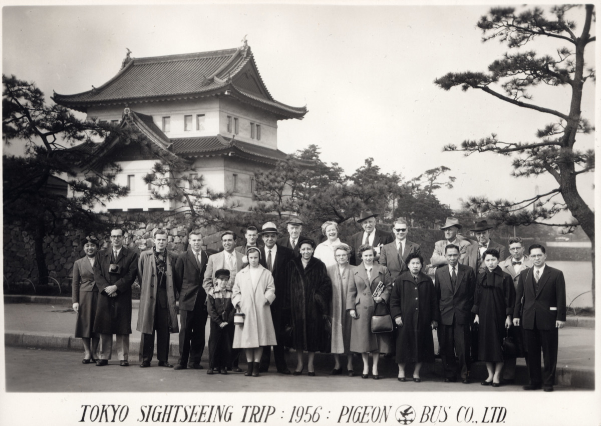 En grupp turister i Japan står uppradade utomhus. De är på bussutflykt med Pigeon Bus Co Ltd. till/i Tokyo. I gruppen står Stefan Centerwall, besättningsman på KUNGSHOLM, och ett par av hans kollegor. KUNGSHOLM var ute på en lång jorden-runt kryssning under våren 1956 och även besättningen fick möjlighet att gå i land och se sig omkring under de många hamnstoppen. Ibland ordnades speciella utflykter för besättningen (som vanligtvis inte fick beblanda sig med kryssningsresenärerna), till fördelaktigt pris, och i bland gjorde besättningen egna utflykter, då ofta i mindre grupper. Detta fotografi är taget under fartygets hamnstopp i Yokohama 13-16 mars då Stefan och några av hans kollegor valde att åka på utflykt med ett bussbolag.
