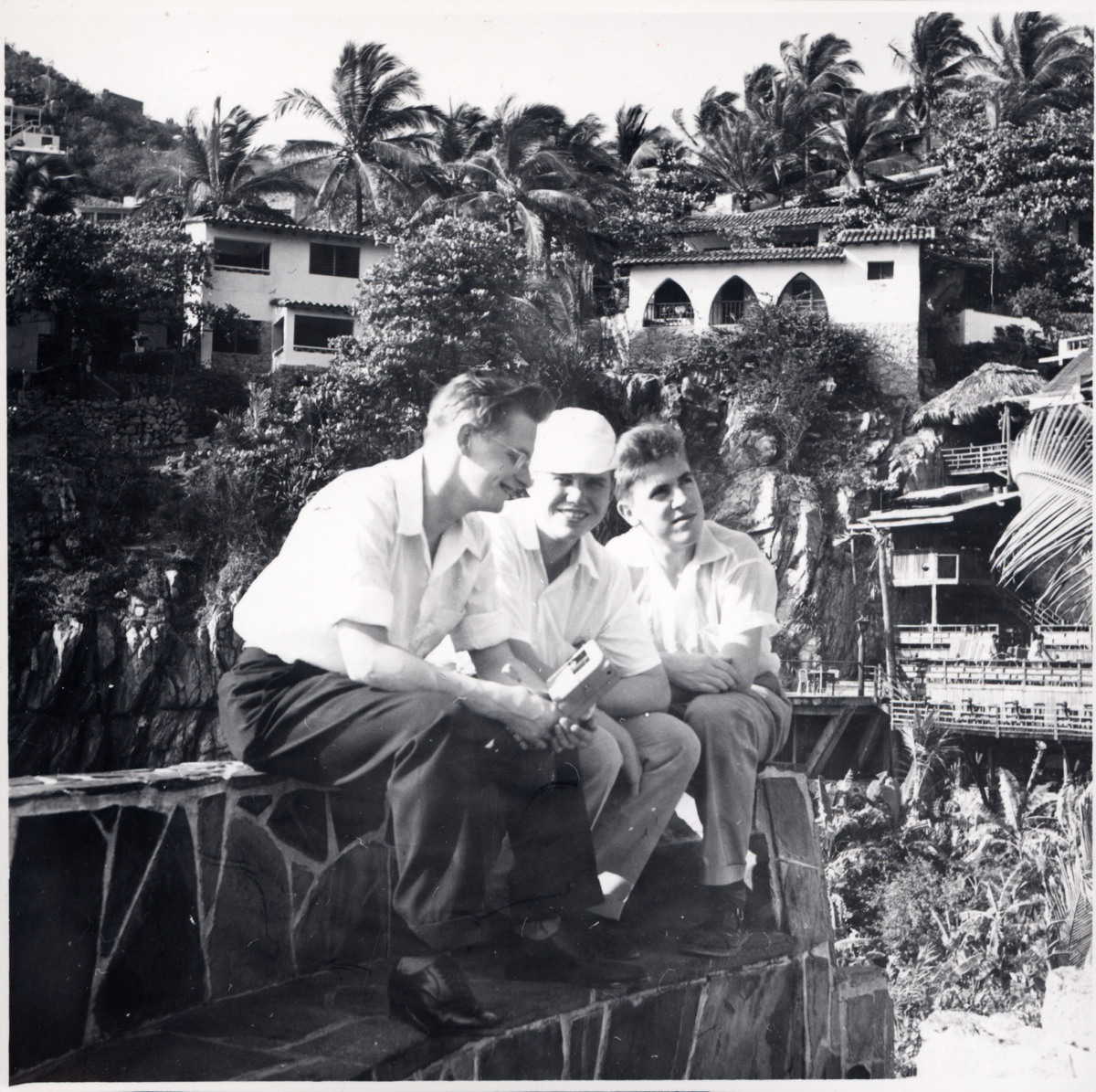 De tre kollegorna Stefan Centerwall, Mats Carlberg och Bengt sitter utomhus på en stenmur i Acapulco, Mexico. I närheten (bakom?) ligger den kända dykklippan. Alla tre arbetade som hisspojkar på KUNGSHOLM under fartygets långa jorden-runt kryssning under våren 1956. Även besättningen fick möjlighet att gå i land och se sig omkring under de många hamnstoppen. Ibland ordnades speciella utflykter för besättningen (som vanligtvis inte fick beblanda sig med kryssningsresenärerna), till fördelaktigt pris, och i bland gjorde besättningen egna utflykter, då ofta i mindre grupper (som i detta fall). Detta fotografi är taget under fartygets hamnstopp i Acapulco 4 april 1956.
