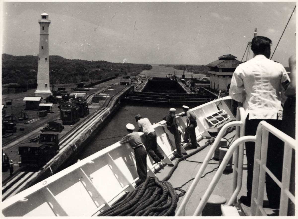Utsikt över fören på KUNGSHOLM. En grupp ur besättningen står på barbords sida, lutandes mot relingen. Det är 8 april 1956 och KUNGSHOLM är på väg genom Panamakanalen. Fartyget var då i slutet av sin långa jorden-runt kryssning under våren 1956.