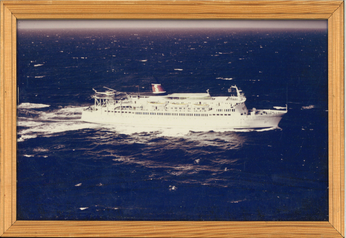 Färgfotografi föreställa färjan till havs. Inramad i träram.