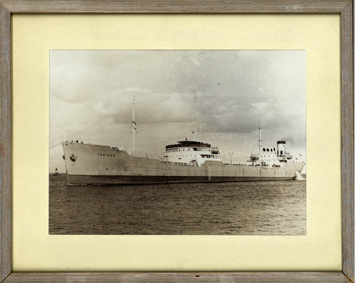 Svartvitt inramat fotografi föreställande fartyget TOSTERÖ.
