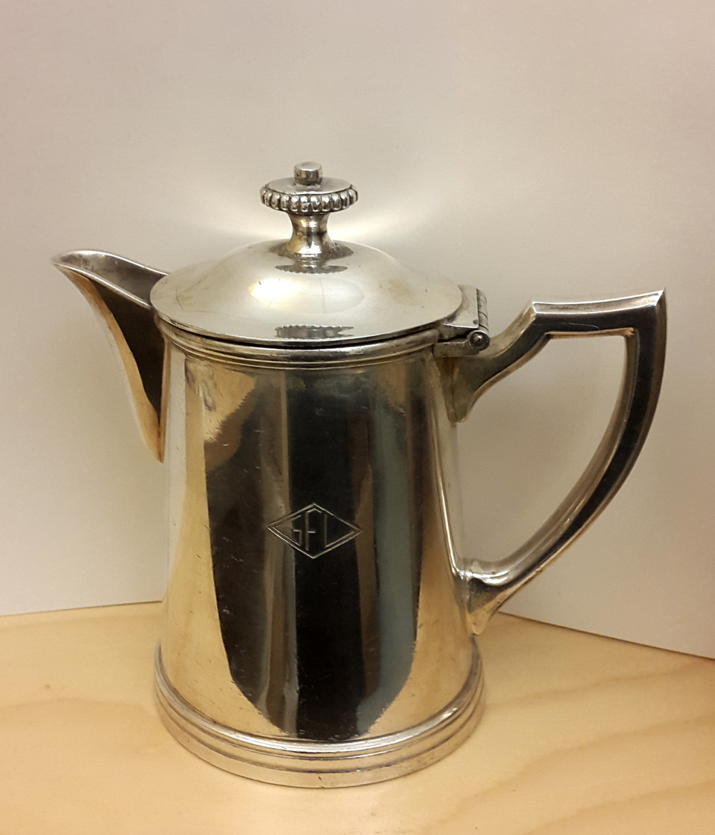 Liten kaffekanna med lock i rostfritt stål för servering vid bordet.