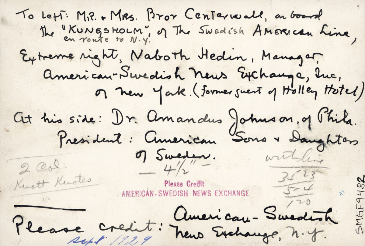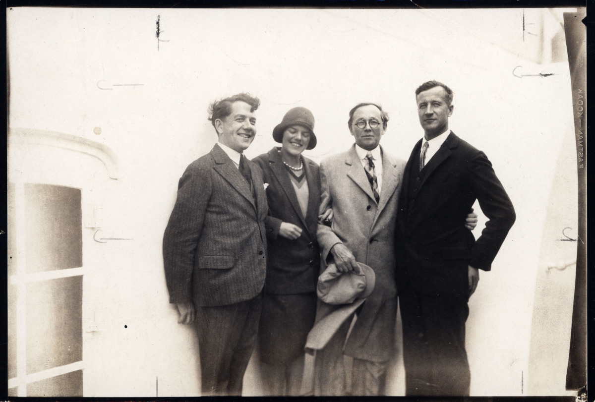 Bror och Marta Centerwall står på KUNGSHOLMs däck. De är på väg till New York. Bredvid Marta står medpassagerare Naboth Hedin och bredvid honom står Amandus Johnson. Fotografiet är taget ute på däck i september 1929.