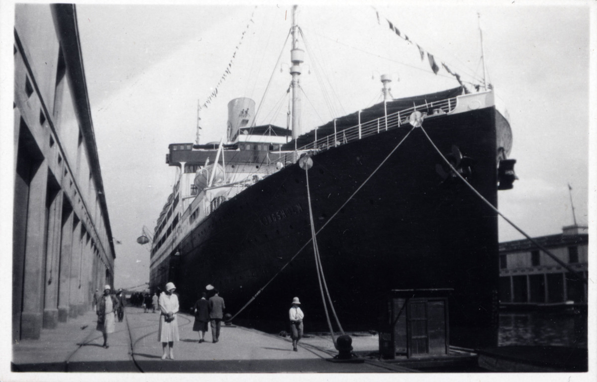 Fotografiet taget i Panama i mars 1930, sannolikt i Colon, under KUNGSHOLMs kryssning runt Västindien. Bror och Marta Centerwall deltog i kryssningen under sin vistelse i USA. På bilden syns fartyget KUNGSHOLM liggandes vid kaj. Människor syns på kajen bredvid fartyget. Till vänster syns sidan av en hamnbyggnad.