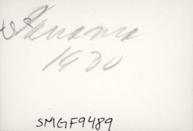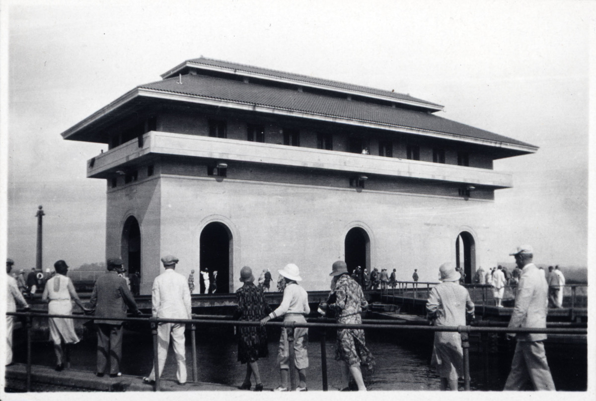 Fotografiet taget i Panama i mars 1930 under KUNGSHOLMs kryssning runt Västindien. Bror och Marta Centerwall deltog i kryssningen under sin vistelse i USA. På bilden syns några av deras medpassagerare framför en stor byggnad.