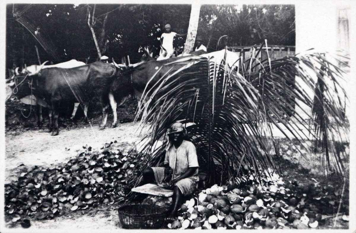 Fotografiet taget på Jamaica i februari/mars 1930 under KUNGSHOLMs kryssning runt Västindien. Bror och Marta Centerwall deltog i kryssningen under sin vistelse i USA. Bilden visar personer och djur på Jamaica. I förgrunden sitter en person under ett palmblad och. Bredvid personen ligger två högar med kokosnötskal. I bakgrunden syns kor, träd samt ytterligare personer.