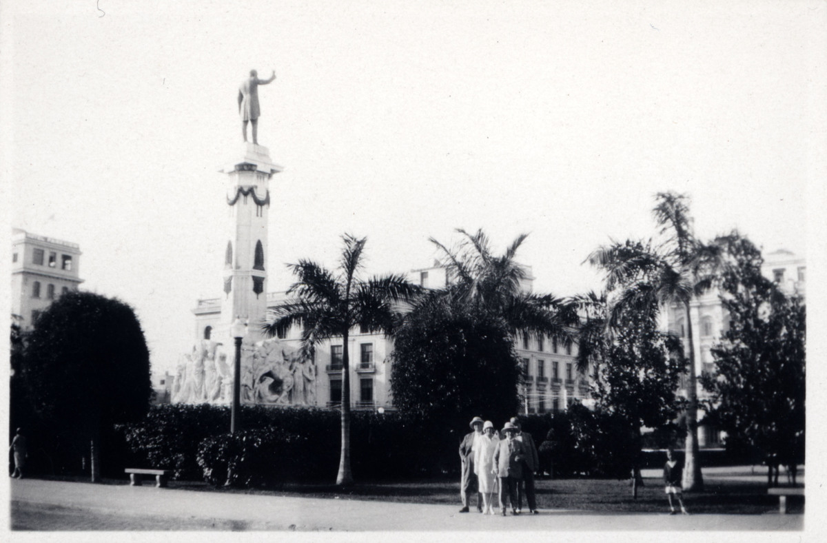 Fotografiet taget i Havanna på Cuba i februari/mars 1930 under KUNGSHOLMs kryssning runt Västindien. Bror och Marta Centerwall deltog i kryssningen under sin vistelse i USA. Bilden visar en grupp kryssningspassagerare ståendes i en park i Havanna. I bakgrunden syns palmer, en stor byggnad och en hög pelare med en staty på toppen.