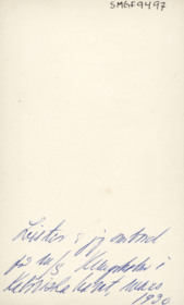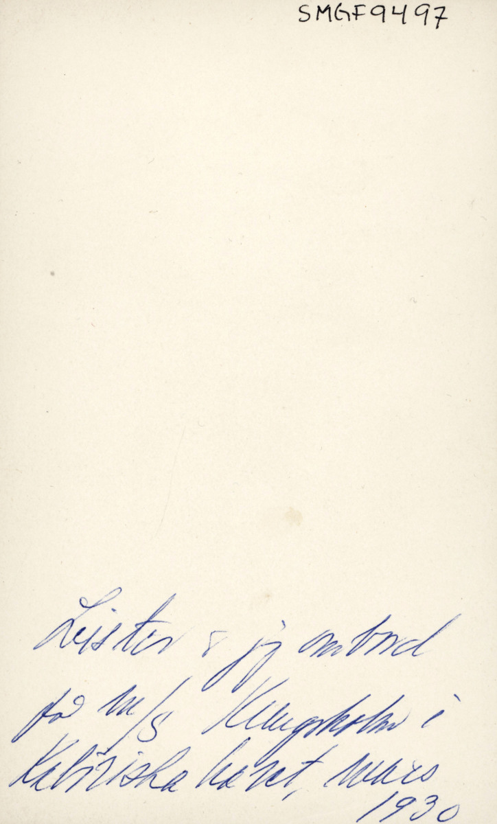 Fotografiet taget i mars 1930 under KUNGSHOLMs kryssning runt Västindien. Bror och Marta Centerwall deltog i kryssningen under sin vistelse i USA. På bilden står Marta Centerwall på fartygets däck tillsammans med medpassgeraren Leister.