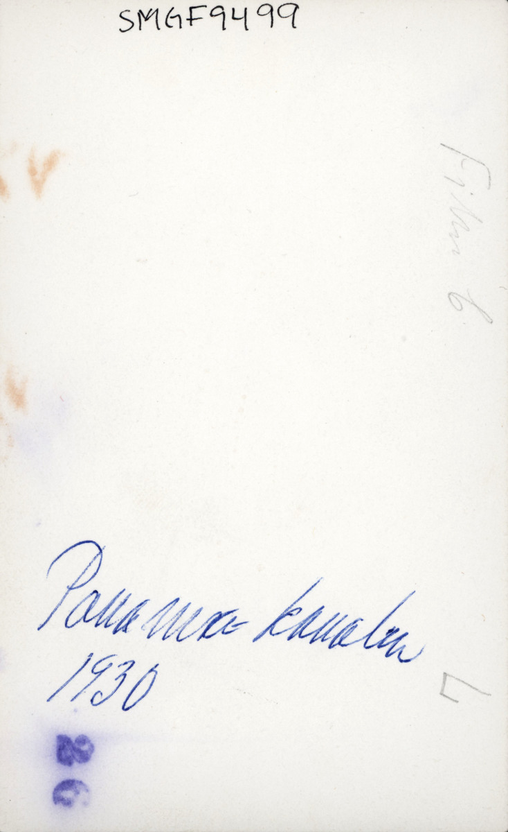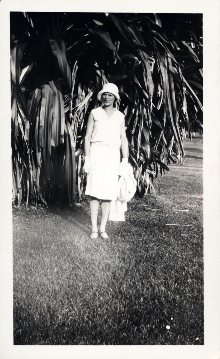Fotografiet taget i februari/mars 1930 under KUNGSHOLMs kryssning runt Västindien. Bror och Marta Centerwall deltog i kryssningen under sin vistelse i USA. På bilden står Marta Centerwall utomhus framför en palm. Fotografiet är taget vid Panamakanalen.