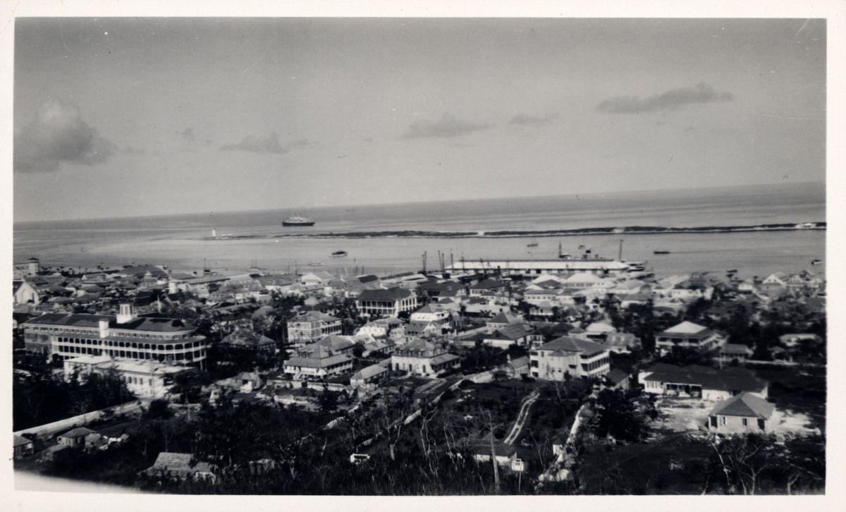 Fotografiet taget i Nassau på Bahamas i mars 1930 under KUNGSHOLMs kryssning runt Västindien. Bror och Marta Centerwall deltog i kryssningen under sin vistelse i USA. Bilden är tagen från en höjd och visar en stadsvy över staden med vattnet i bakgrunden.