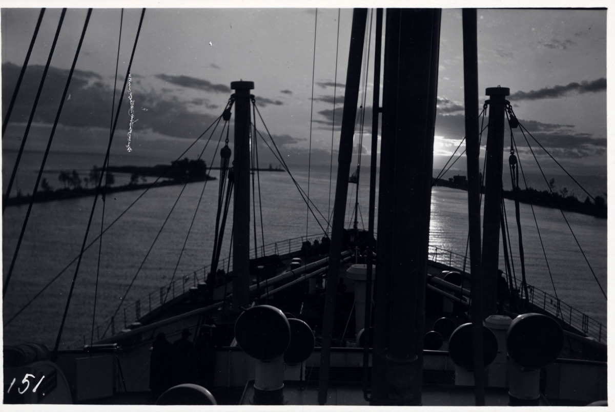 Marta och Bror Centerwall deltog i en kryssning i Östersjön med Svenska Amerika Liniens GRIPSHOLM sommaren 1933. På bilden syns fartygets förliga parti under utsegling från St Petersburg (dåvarande Leningrad). Fotot är daterat till augusti 1933.
