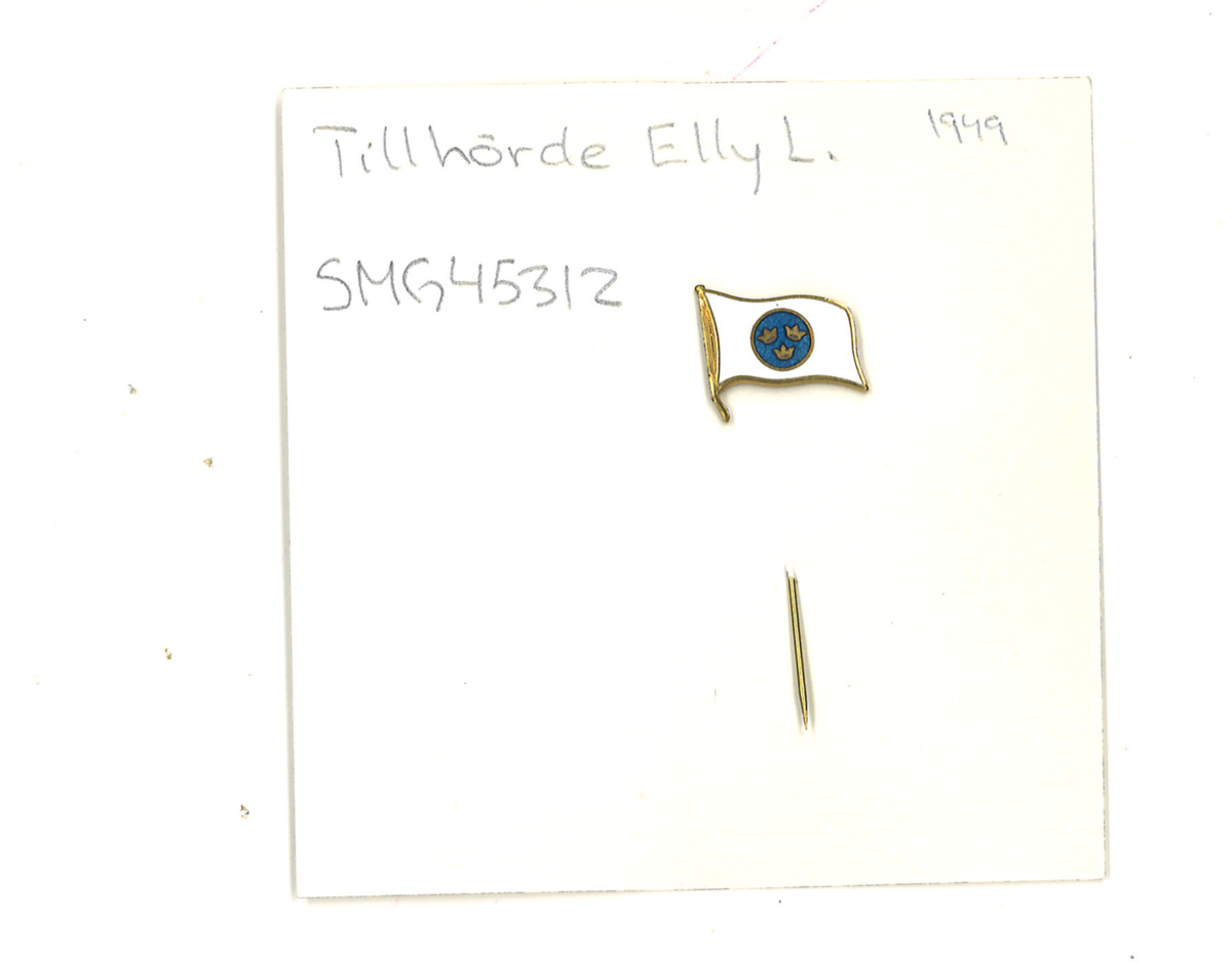 Kavajnål i form av SALs flagga, vi botten med en blå cirkel och tre kronor.