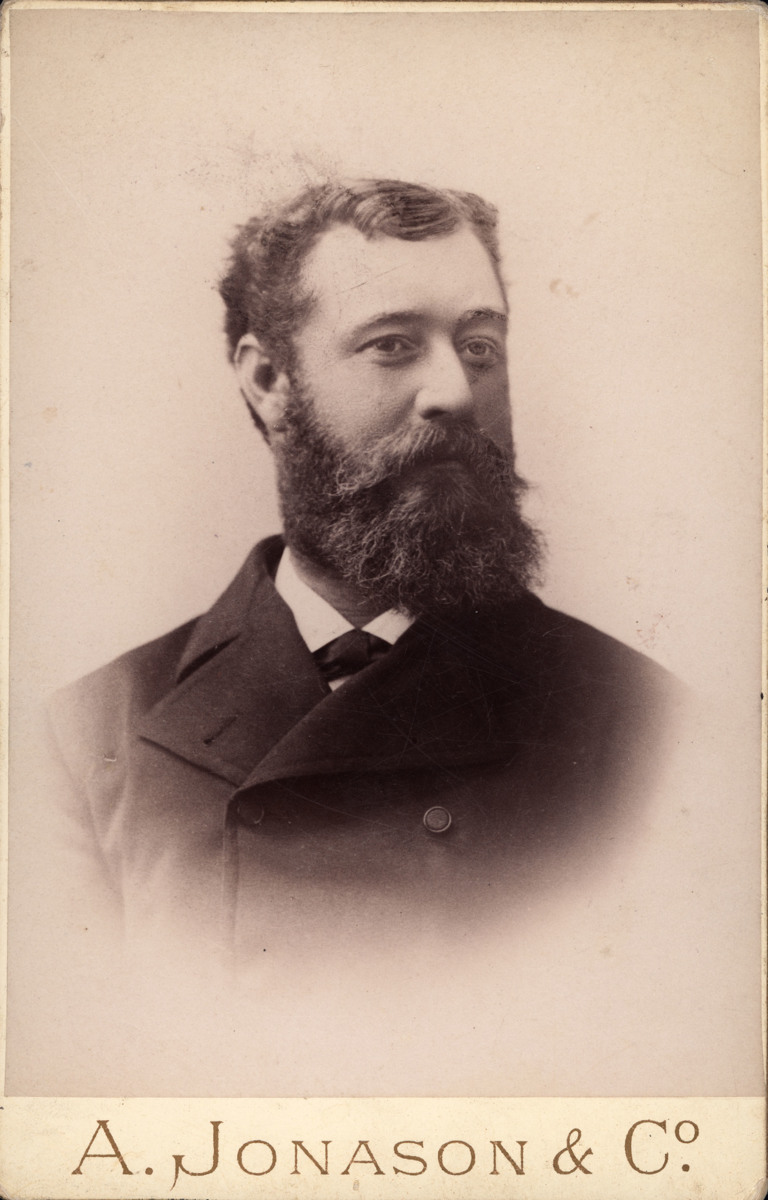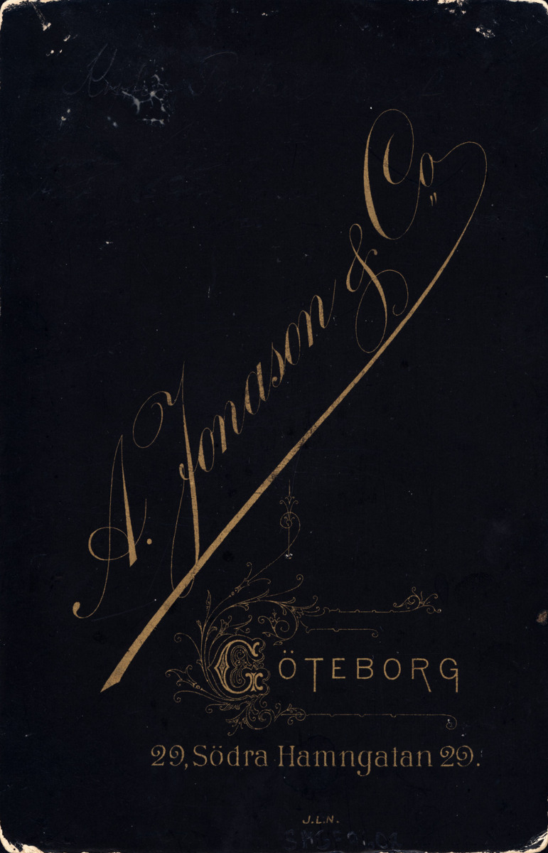 Svartvitt fotografi uppklistrad på kartong föreställande kapten Torkel Blixt. Kapten på en av Ångfartyg AB Göta Kanals båtar.