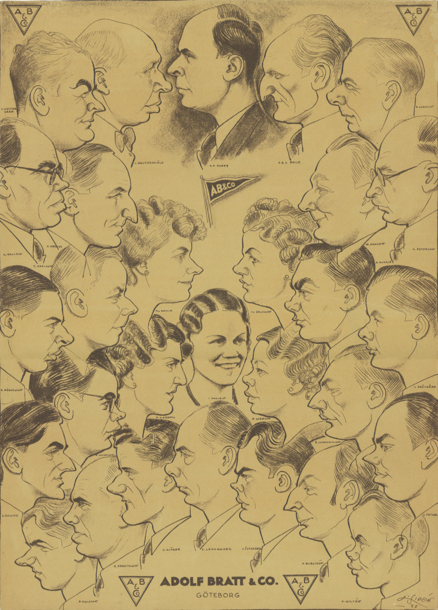 Litografi föreställande karikatyrer av 29 anställda vid Adolf Bratt & co i Göteborg, främst företagets ledning och chefer. Daterad 1938. Teckningarna baserades på fotografier (SMGF9693-9696).