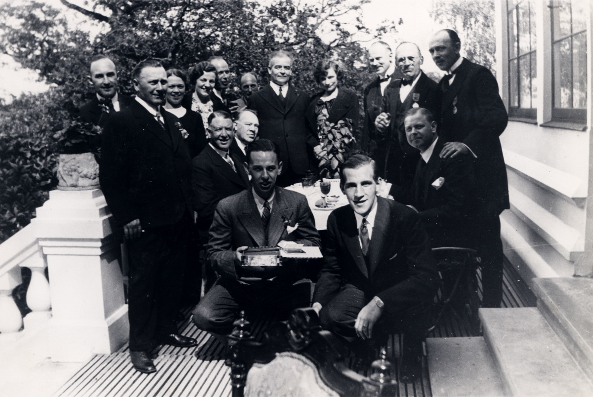 Fotografi föreställande anställda vid Adolf Bratt & co i Göteborg. Fotografiet användes av konstnären Liss Sidén som underlag för att framställa en karikatyr på företagets anställda år 1938 (SMG45327)
