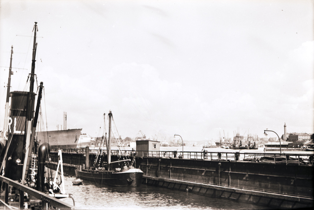 Dockan vid Eriksbergs varv år 1949. En båt/mindre fartyg ligger i dockan. Till vänster skymtar en bogserbåt.