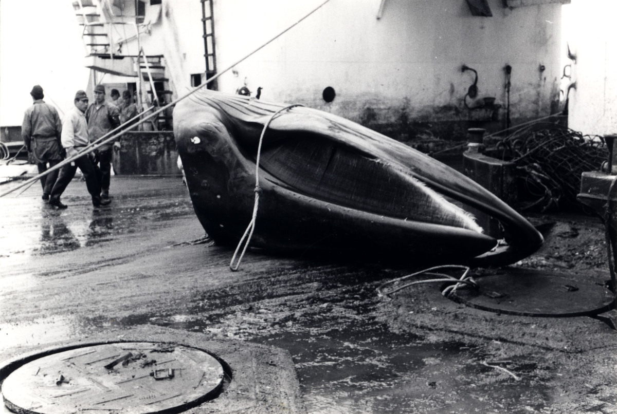 Ett valhuvud ligger på däck ombord det japanska valfångstfartyget NISSHIN MARU 3.