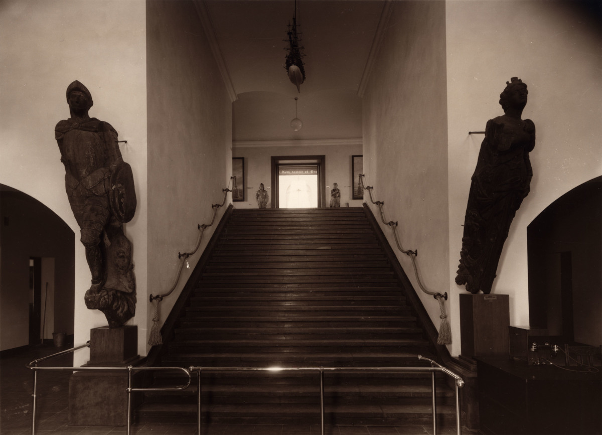 Fotografiet visar Sjöfartsmuseets stora huvudtrappa från entreplan till andra våningen, dekorerad med galjonsfigurer på varsin sida och en fartygsmodell hängande i taket, så som det såg ut när museet öppnade sommaren 1933.