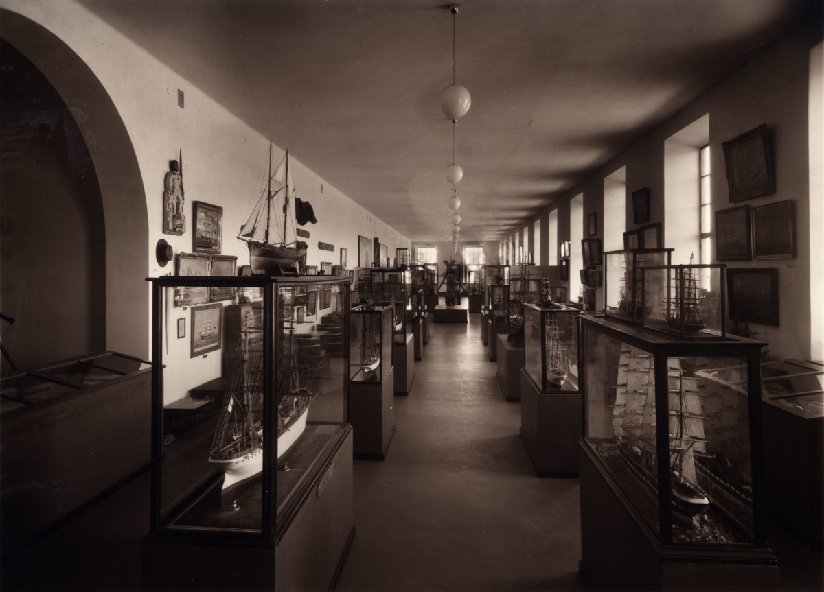 Fotografiet visar en del av Sjöfartsmuseets basutställning på andra våningen så som det såg ut när museet öppnade sommaren 1933. Utställningsdelen handlar om 1800-talets segelsjöfart och är fylld med modeller, konst och diverse andra föremål. Den fanns i museets norra långsida.