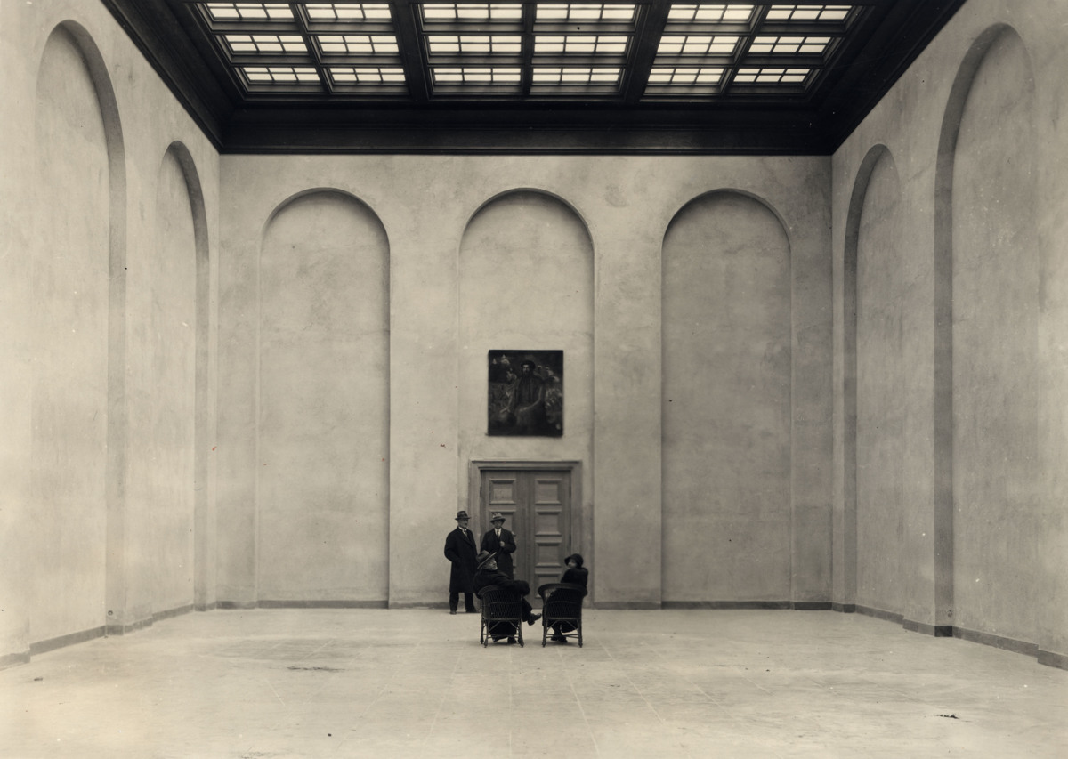 Fotografiet visar Minneshallen på våning två i det då nybyggda Sjöfartsmuseet i oktober 1932 (byggnaden stod klar 1 oktober 1932). Rummer är omöblerat så när som på ett konstverk som hänger på bortre väggen. Fyra personer finns i rummet: museichef Olof Traung och arkitekt Karl M Bengtson står vid bortre dörren och konstnärsparet de Rougemont sitter i två stolar.