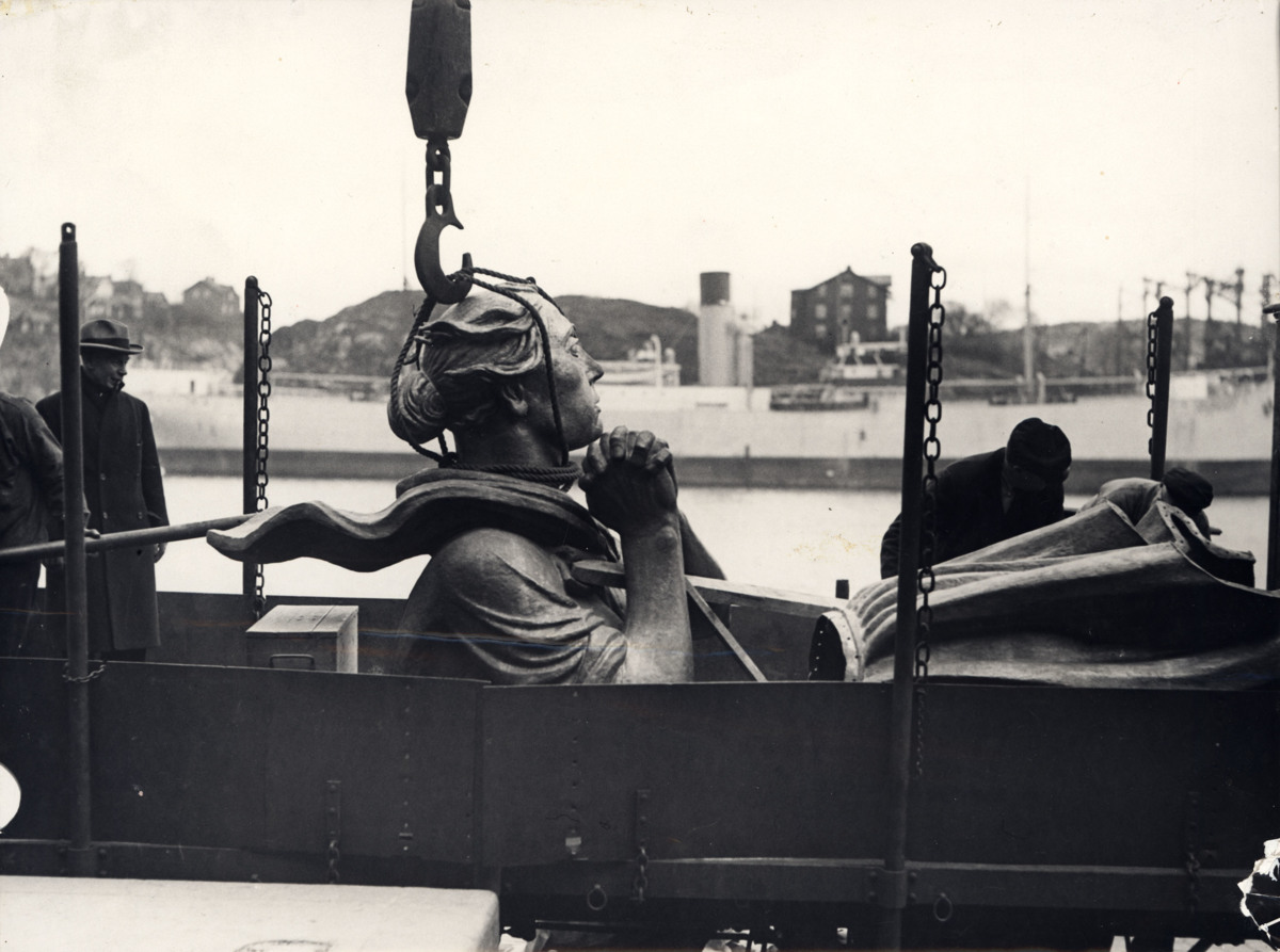 Statyn Sjömanshustrun ligger i delar på ett lastbilsflak, redo att lyftas upp och sättas fast övers på Sjömanstornet. Några män skymtar i bakgrunden.