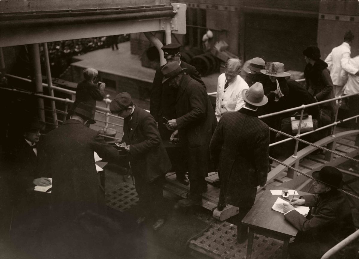 Emigranter och andra resenärer genomgår passkontroll vid ombordstigning på Svenska Amerika Liniens fartyg STOCKHOLM. Fartyget ligger vid Amerikakajen i Göteborgs hamn.