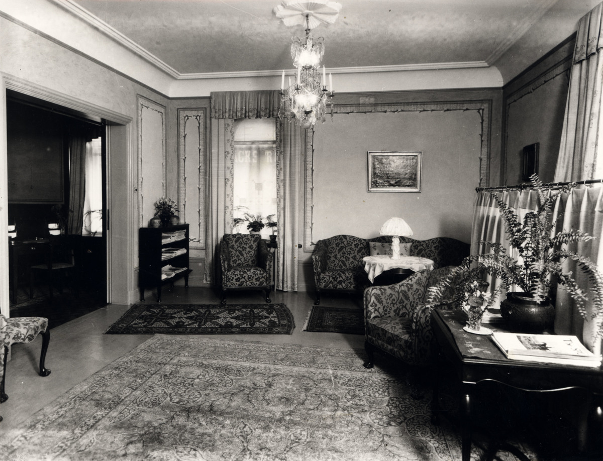 Interiörbild från Hotell Hembygden. Ett stort rum med soffa och två fåtöljer, bord och stolar samt diverse inredningsdetaljer. Uppklistrad på kartong.