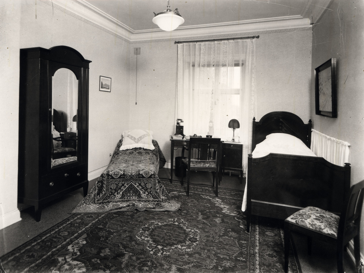 Interiörbild från Hotell Hembygden. Ett hotellrum med två sängar, två stolar, ett skrivbord och en garderob.