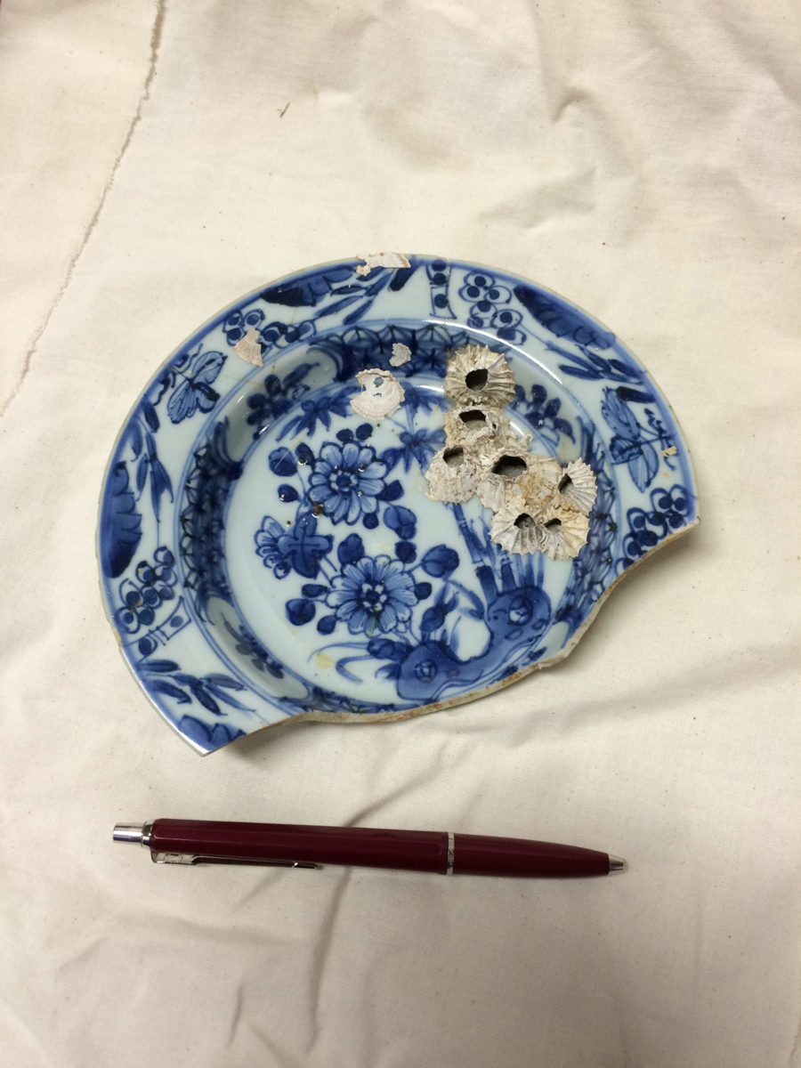 Föremålet är från vraket av ostindiefararen Götheborg, som gjorde tre resor till Kina 1739-45. Vid hemkomsten från den sista resan 12 september 1745 förliste fartyget vid grundet Hunnebådan strax utanför Nya Elfsborgs fästning. Vid flera tillfällen har material tagits upp från vraket. Föremålet kommer från de marinarkeologiska utgrävningarna på platsen 1986-1992.