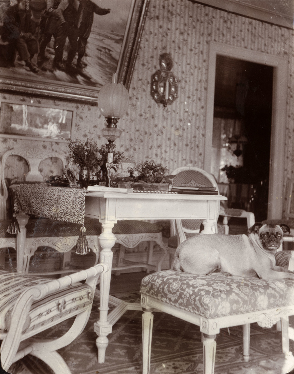 Interiörbild från paret Kennedys sommarhus Villa Rosenborg, som låg i Arendal på Hisingen. På en pall ligger en hund.