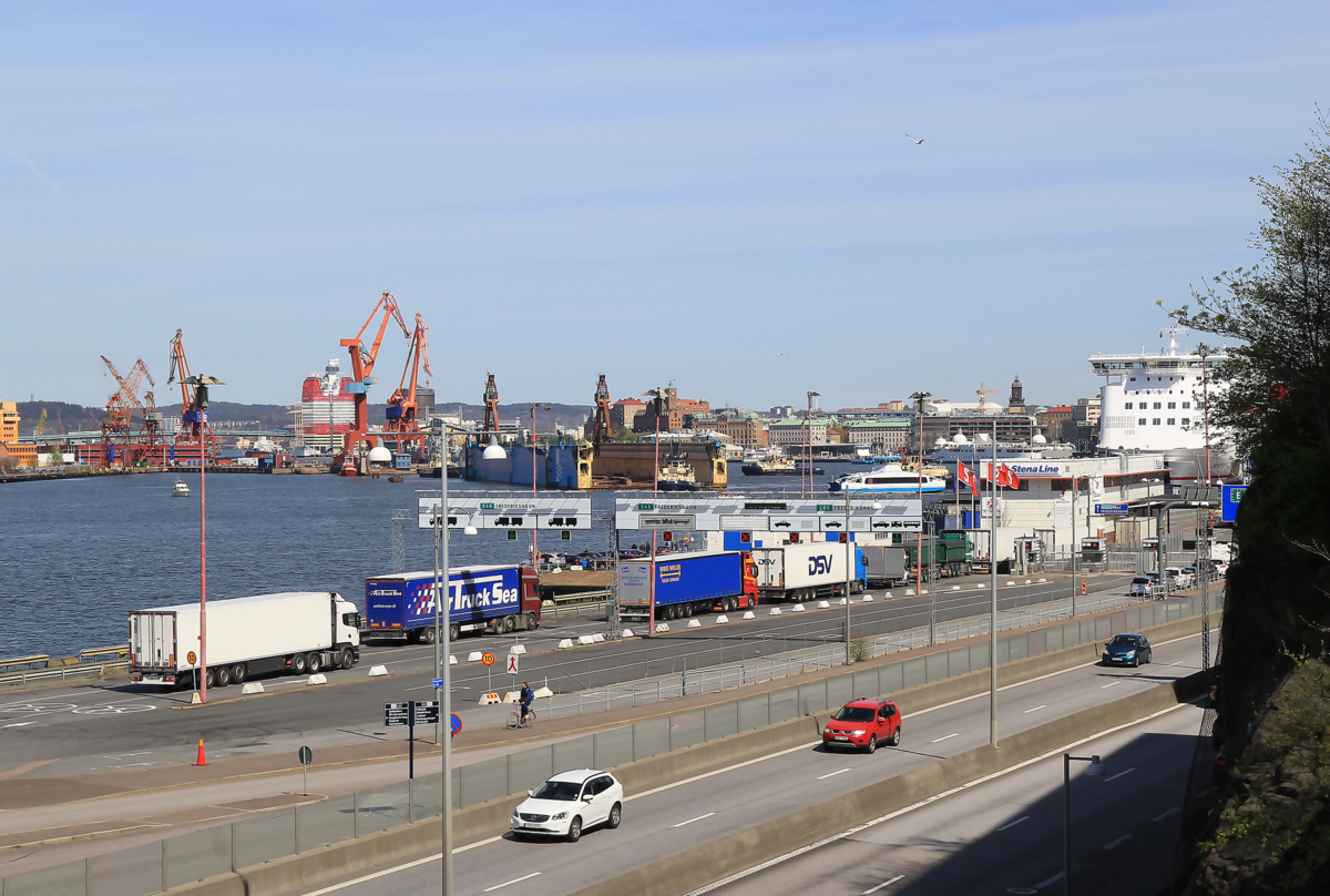 Vy över Göta Älv, i förgrunden Oscarsleden med bilar och delar av Stena Lines Danmarksterminal. I mitten av bilden syns Götaverkens docka tillsammans med bogserbåtar och lotbåtar. I bakgrunden skymtar delar av Götaverkens område samt delar av centrala Göteborg.