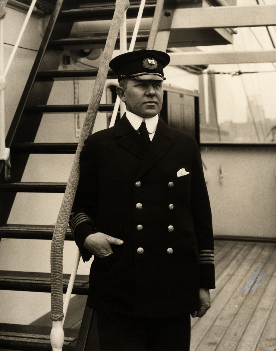 Kapten Gunnar Anderberg står ute på däck, sannolikt ombord ett av Svenska Amerika Liniens fartyg. Bakom sig har han en trappa (lejdare). Fotografiet är taget i New York.
