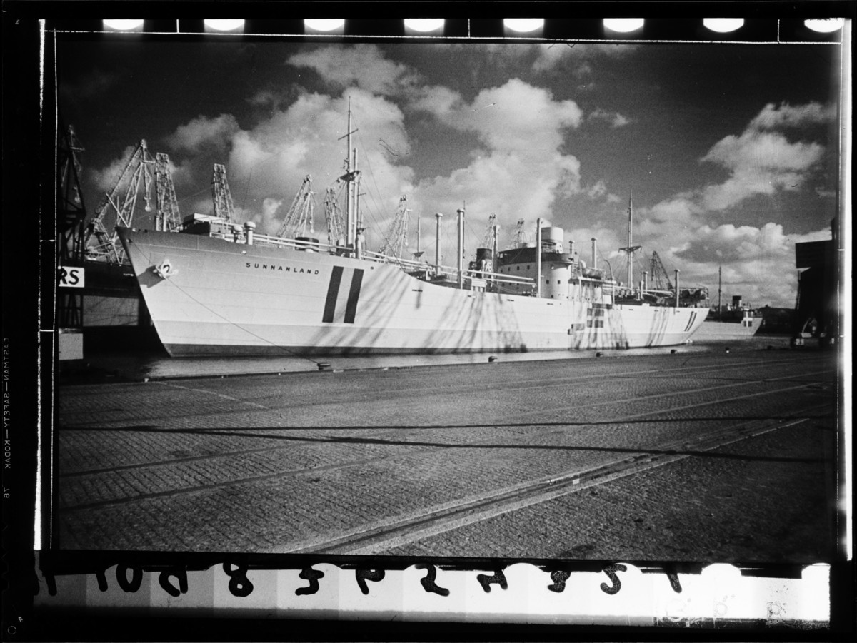 Fartyget SUNNANLAND ligger vid en kaj. Fartyget är delvis neutralitetsmålat - svenska flaggor är målade på fartygets sidor men ordet Sverige syns inte, vilket var brukligt att måla tillsammans med flaggor, under andra världskriget. På grund av detta är det sannolikt att fotografiet är taget under våren eller tidig sommar 1940 vid utrustningskajen vid Eriksbergs varv i Göteborg. SUNNANLAND sjösattes från Eriksbergs varv 11 mars 1940 och utrustades under våren. Då bör även neutralitetsmålning ha genomförts. Fartyget levererades till och togs i bruk av Ångfartygs AB Tirfing i juli 1940.