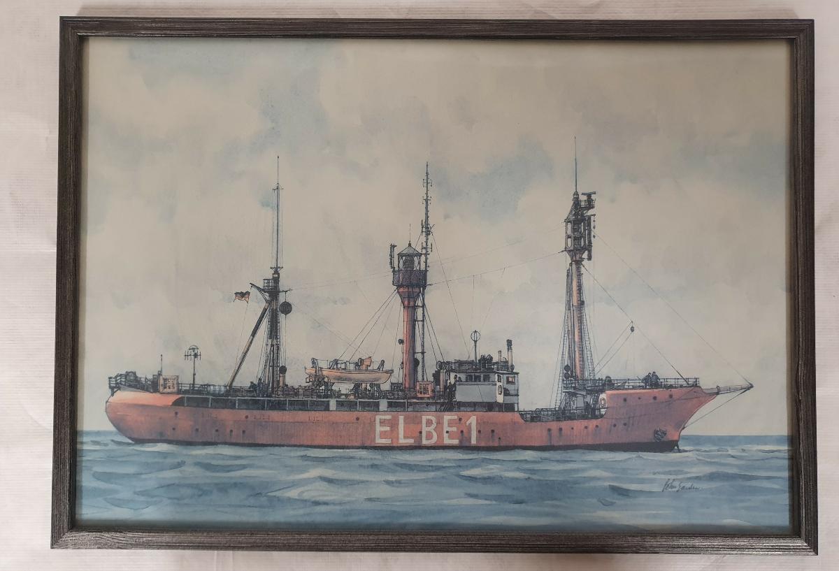 Färgtryck föreställande fyrskepp. Förlagan målad i akvarell.