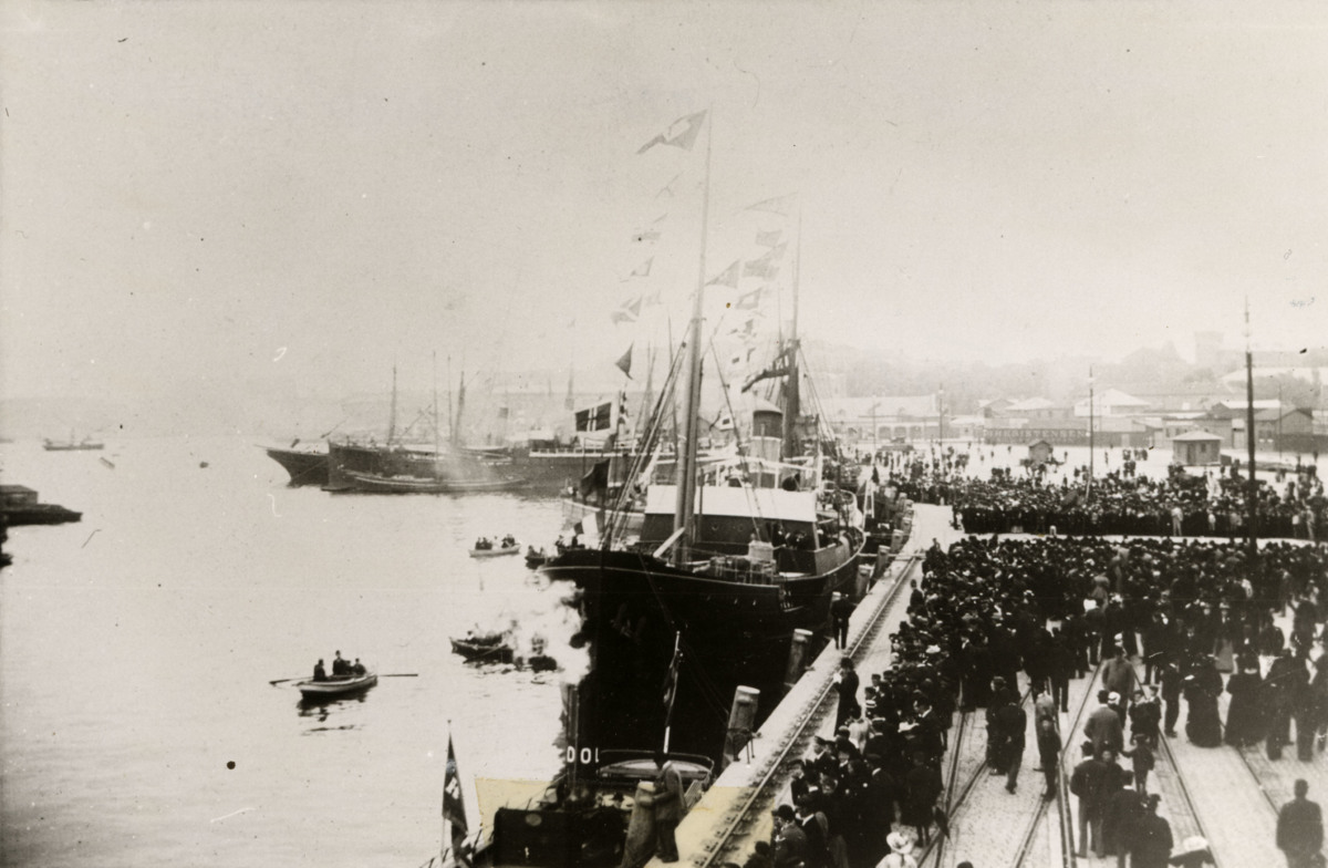 Fartyget VIRGO vid Masthuggskajen i Göteborg 7 juni 1896, strax innan avfärd. VIRGO transporterade Salomon August Andrée och hand kompanjoner till Danskön på Spetsbergen, varifrån de ämnade lyfta med sin luftballong för att åka över Nordpolen