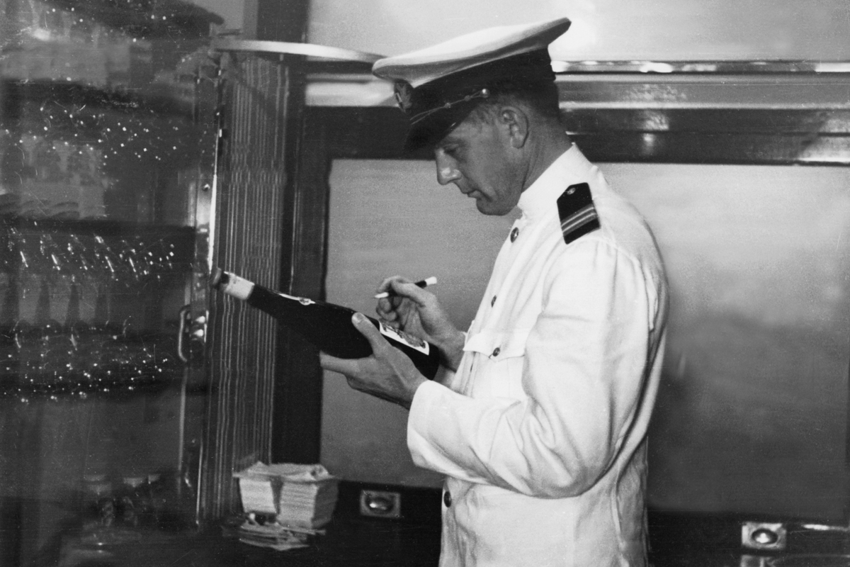 Purser Gustaf Dahlström i vinförrådet ombord KUNGSHOLM