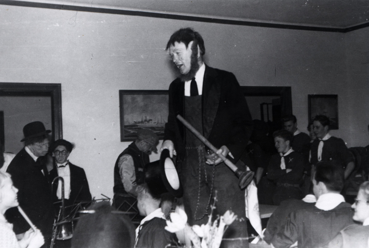Påskrift: Från 40-års jubileet på Sjöfartsmuseet. Från Sjöscouternas 40-årsfest. Erland Ekström som kapellmästare i kalingkapellet. 9/1 1954