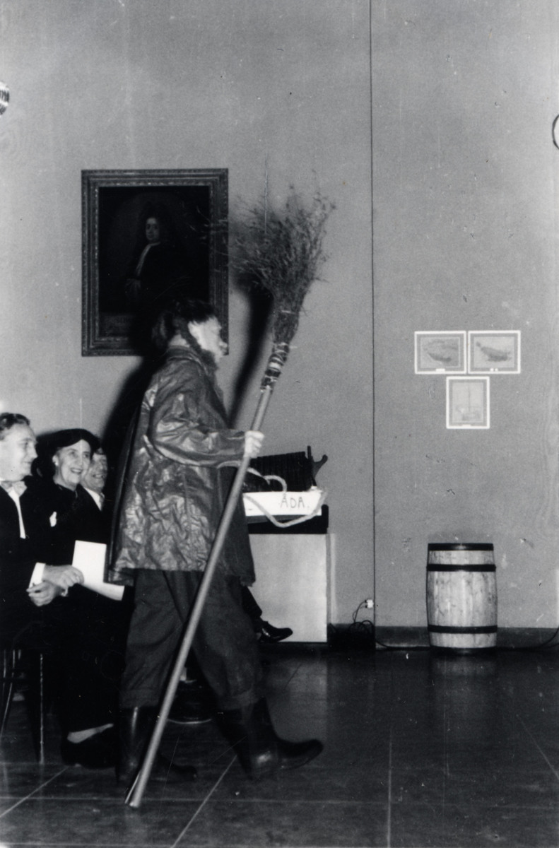 Erland Ekström, utklädd till fiskargubbe och med kvast i handen, underhåller vid Göteborgs Sjöscoutkårs 40-årsjubileum på Sjöfartsmuseet den 9 januari 1954.