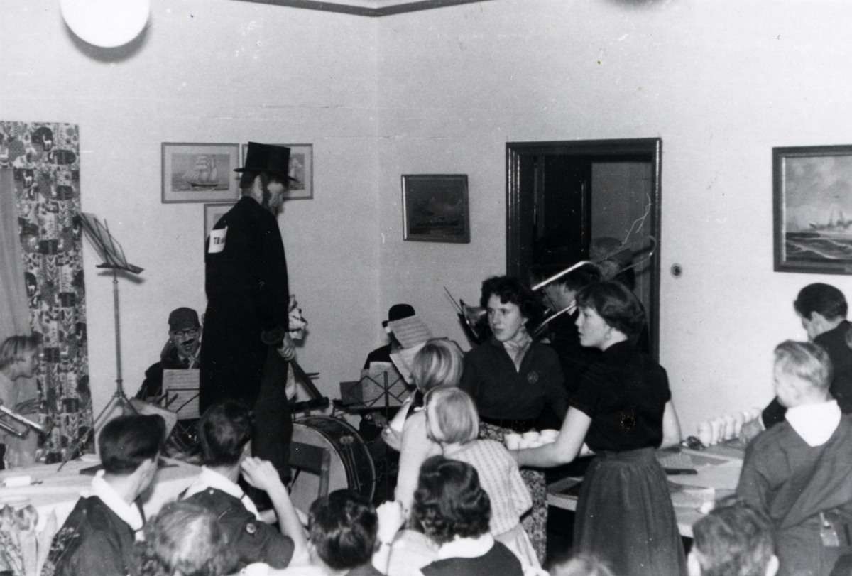 Fotografiet är taget under Sjöscouternas 40-årsfest på Sjöfartsmuseet den 9 januari 1954. Erland Ekström står framför musikerna i Kalingkapellet och underhåller en grupp unga sjöscouter.