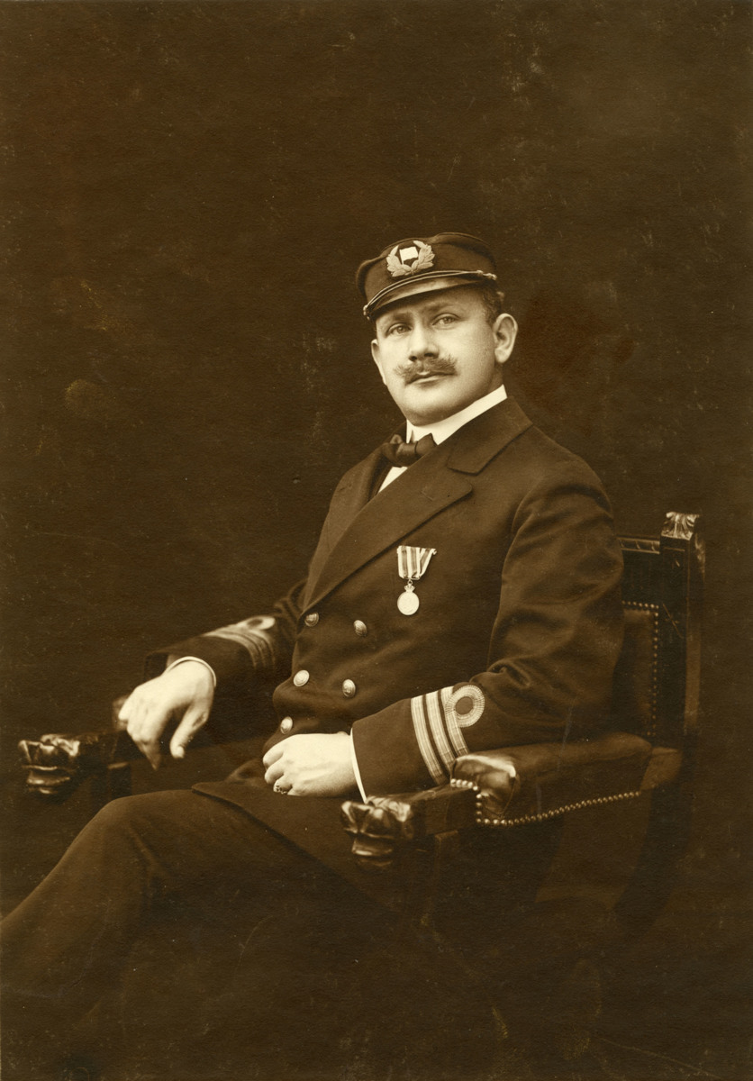Föreställande Oscar i uniform sittande i en stol. Fotografiet är taget på The Swiss Studios i Melbourne.