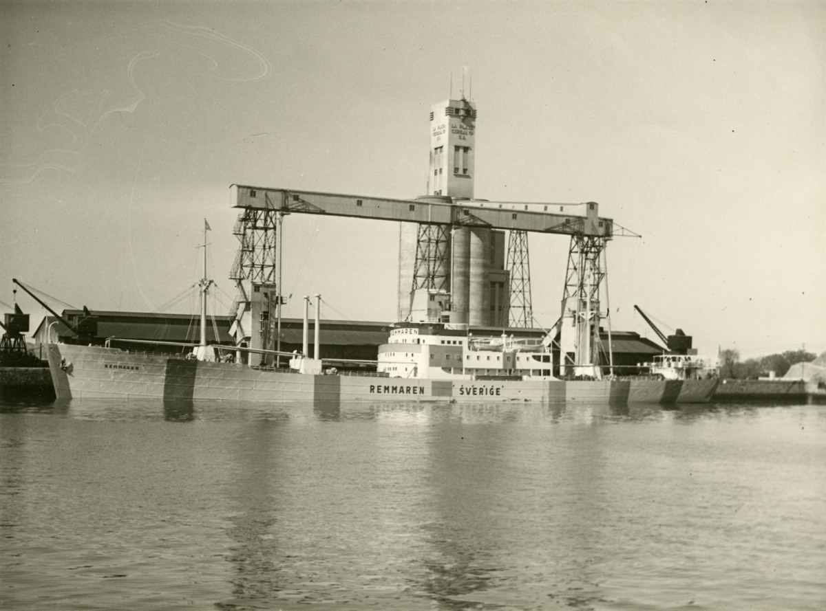 Svartvitt fotografi föreställer fartyget REMMAREN i neutralitetsmålning liggande vid kajen. REMMAREN var Oscar Huldtgrens sista fartyg. Buenos aires?