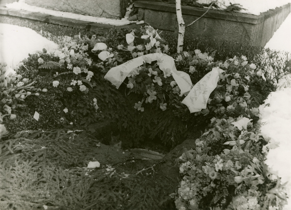 Dokumentationsbild tagen vid urnsättningen. Blomsterhavet vid graven.